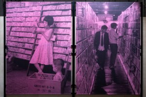 La petite salle du sous-sol est parfaite pour s’endormir tant elle est sombre et qu’une des deux vidéos (41 minutes) nous berce de sa voix monotone (une Chinoise parlant un anglais très clair, rendant le sous-titrage en français inutile) et parfaitement soporifique. L’entretien (en japonais, sous-titré en français et en anglais), d’une durée de 21 minutes, passe heureusement nettement mieux. Quoi qu’il en soit, j’ai pu faire des photos intéressantes, malgré la foule (pourtant nous sommes venus tôt un dimanche matin). Voilà qui prouve, s’il le fallait, le succès de l’exposition, succès claironné par la Fondation Cartier, succès valant une prolongation qui nous a permis d’y aller !
