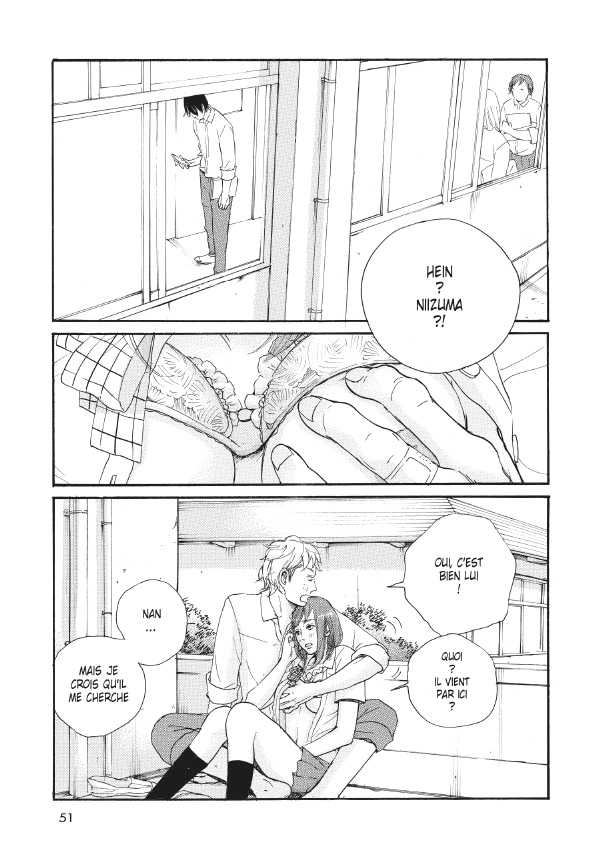 Les relations amoureuses homme / femme passent par l’obligation d’être actifs pour les premiers, passives pour les secondes. En proie au silence présente plusieurs situations intéressantes illustrant ce thème et ses limites : il y a Erisa Misakana, la lycéenne très populaire qui n’a pas l’air soumise à Wadajima, son (plus ou moins) petit copain. Il y a aussi Niizuma qui a couché avec une femme mariée. N’oublions pas la petite amie officielle de Niizuma qui se demande si elle doit accepter les avances des (rares) garçons qu’elle intéresse (certes, elle a de gros seins mais elle est plutôt grosse et quelconque). Il y a surtout Hayajuji, le type même du prédateur sexuel qui sait manipuler les femmes pour obtenir ce qu’il veut : leur sexe. Ce même Hayajuji vit en couple avec Minako mais trouve toujours l’excuse du travail pour repousser les besoins de cette dernière. Le besoin sexuel féminin est ainsi plus ou moins mis en avant mais considère aussi que l’acte sexuel peut être une sorte de négociation entre la femme et l’homme, on couche pour exprimer le souhait d’être en couple. Cette considération se retrouve, confirmée ou infirmée par les différents personnages de la série.