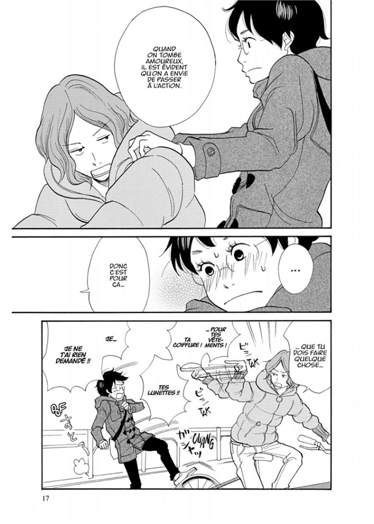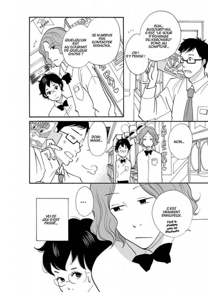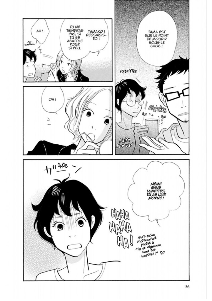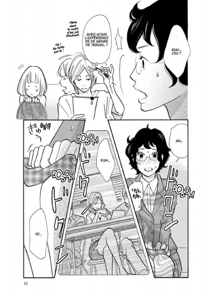 La série First Job New Life ! a donc été prépubliée dans le magazine Feel Young des éditions Shodensha. Elle nous propose deux thématiques, très classiques, qui nous rappellent l’époque bénie de la collection Sakka (lorsqu’il nous était proposé Fumi Yoshinaga, Q-Ta Minami et Kiriko Nananan) : la vie professionnelle et la vie amoureuse des jeunes femmes japonaises. Avec un dessin rappelant parfois Mari Okasaki, parfois Chika Umino, mais surtout George Asakura et même Moyoko Anno, Yoko Nemu nous propose une histoire au dessin plaisant et efficace, à la narration bien rythmée, sans oublier une galerie de personnages mémorables, à commencer par la débutante Tamako. Cette dernière est volontaire, même si elle est très timide et sans expérience de la vie. Elle est touchante dans ses efforts pour réussir dans un métier dont elle ignore quasiment tout. Il en est de même avec ses sentiments envers un de ses collègues. En effet, le premier tome est composé en deux temps : la découverte du travail, puis la découverte de l’amour. Dans les deux cas, rien n’est simple, surtout pour Tamako, inexpérimentée dans les deux domaines. Néanmoins, elle apprend vite.