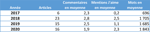 Cela représente donc beaucoup de travail pour un retour quasi inexistant. En effet, comme le montre le tableau des articles, mes billets reçoivent très peu de mentions « J’aime » et à peine plus de commentaires (et encore, je réponds systématiquement, ce qui gonfle les stats). Avant de me pencher sérieusement sur le sujet, je pensais que la chute que l’on peut observer en 2019 était en grande partie imputable à la défection de a-yin et de Shermane étant donné qu’elles avaient décidé de prendre « du recul » avec les blogs et que je perdais ainsi deux contributrices importantes en matière de « J’aime » et de commentaires. En fait, non. Je pense maintenant que je suis le seul responsable de cette chute en 2019 en ayant fait trop de dossiers et pas assez de textes plus fédérateurs comme des chroniques ou des bilans (mais bon, Shermane n’est pas innocente quand même… 😁 ). Heureusement, alamenthe est venue compenser cette défection. Quoi qu’il en soit, ce défaut de réaction et d’échange est ce qui me manque le plus comparé aux bons vieux forums phpBB comme celui de Mangaverse.