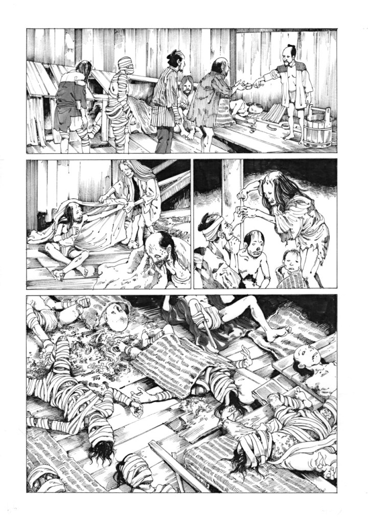 Avec The Princess of the Never-Ending Castle, disponible en anglais (ainsi qu’en italien et en japonais) chez l’éditeur transalpin Hollow Press (une réédition au format un peu plus petit avec une couverture souple est sortie en 2020), Shintaro Kago est nettement plus violent, gore et sexuel. Clairement, il ne s’agit pas d’une œuvre à mettre entre toutes les mains. L’auteur pense qu’il existe une multitude d’univers parallèles. En fait, dès qu’un événement d’importance survient, il peut être à l’origine d’une division en deux de l’univers en cours. Ici, il s’agit de l’assassinat d’Oda Nobunaga par le général Akechi Mitsuhide. Dans un cas, Nobunaga remporte le combat, dans l’autre, c’est Mitsuhide. Il en résulte deux réalités alternatives représentées de façon très originale sous la forme d’une scission d’un château aux multiples étages. Le récit se focalise sur l’épouse de Nobunaga, la princesse Nô. Dans le premier cas, elle continue à conseiller son mari, dans le second, elle cherche à le venger en fomentant une rébellion qui s’appuie sur les rebuts de la société japonaise. Malheureusement, elle est rapidement défaite. Heureusement, elle réussit à s’enfuir vers les bas-fonds du château, jusqu’à retrouver le point de divergence. Et c’est là qu’elle va faire une découverte étonnante qui pourrait lui donner la victoire… Shintaro Kago semble beaucoup s’amuser à mettre en forme une histoire avec une double trame narrative. Il propose régulièrement les deux univers en parallèle en affectant les pages de gauche à l’un et les pages de droite à l’autre. Outre ce jeu formel, il multiplie à l’envie des déformations de corps, des nudités plus ou moins grotesques et des scènes de sexe souvent explicites. L’ensemble montre la grande virtuosité de l’auteur, tant sur le plan graphique que sur le plan narratif. C’est bluffant ! Avec Fraction, il s’agit là du meilleur manga de Shintaro Kago que j’ai pu lire jusqu’ici. Une sorte de suite doit sortir en septembre : The Twelve Sisters of the Never-Ending Castle.