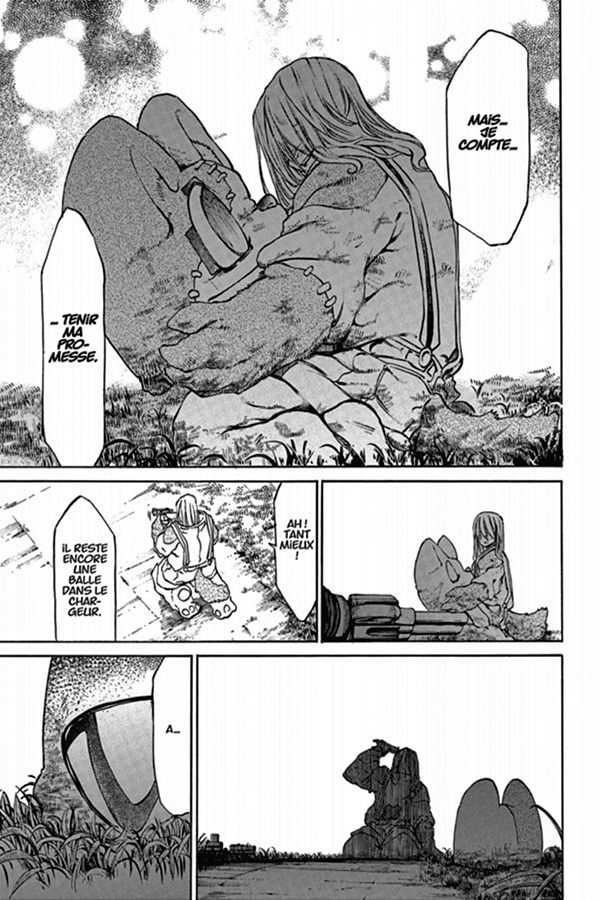 Le graphisme, de plus en plus lugubre au fur et à mesure que Claire et Sûichi s’approchent de leur but, présente régulièrement des trames sombres et/ou de grands aplats de noir, notamment pour dessiner la silhouette des monstres. Le visage de Kaito (un camarade de Sûichi) avec des yeux invisibles dans leurs orbites sombres est tout à fait dans le ton que veut donner le mangaka a son récit. La désespérance s’incarne aussi la laideur des chasseurs de médailles. Ceux-ci, devenus pour la plupart monstrueux et difformes, sont souvent pitoyables. Leur égoïsme et leur bassesse transparaissent ainsi. Ils sont aussi des victimes, quoique coupables de leurs agissements. Mourir est leur porte de sortie, leur chemin vers la délivrance. La déréliction n’est jamais loin et cela pèse sur le moral, quelque soit le camp auquel on appartient. Le monde est maudit et seule sa disparition fera disparaître le malheur !