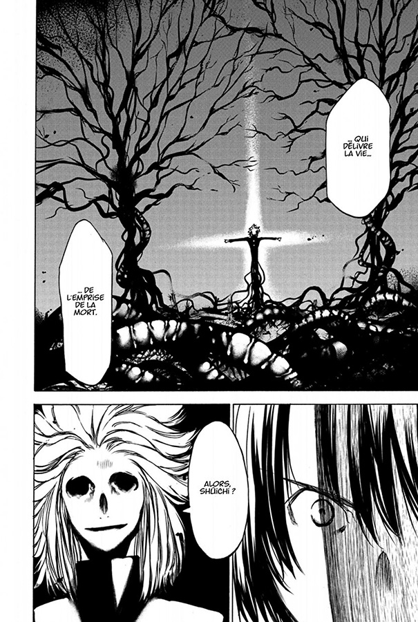 Le mélange action / horreur / mystère et érotisme fonctionne donc très bien dans Gleipnir. Bien entendu, cela ne plaira pas à tout le monde. Quoi qu’il en soit, l’auteur réussit de nous donner envie de lire les chapitres les uns après les autres, grâce à une bonne gestion des périodes d’action, d’introspection et de révélation. De plus, les combats ne s’éternisent jamais. Le manga propose aussi de nombreux personnages ambivalents et intéressants, dont la plupart sont liés à une entité bien trop puissante et dangereuse pour le bien de toutes et de tous. Néanmoins, nul doute que Claire et Sûichi arriveront à la vaincre lors de la bataille finale dont dépendra l’existence de leur monde. Cette certitude n’empêche absolument pas d’apprécier le chemin pris par les protagonistes pour arriver au bout de leur quête. Et surtout, n’oublions pas qu’il y a une autre puissance derrière tout cela…
