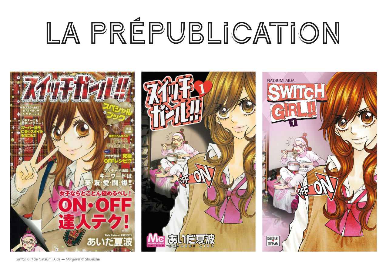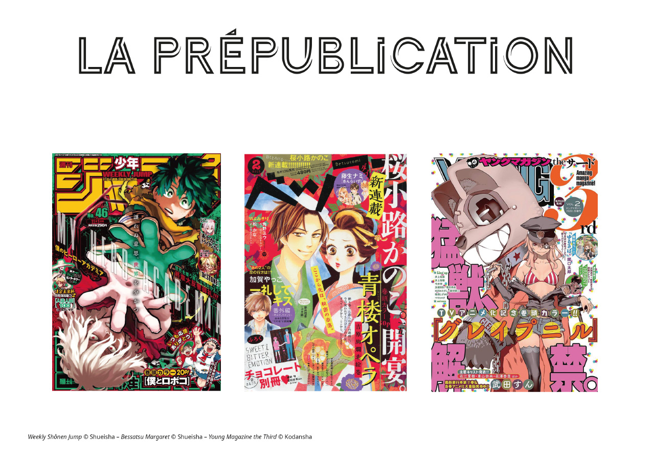 Si en France, on connaît les mangas principalement sous forme reliée, au Japon, les mangas sortent généralement dans des magazines de prépublication. Une fois qu’il y a assez de chapitres et donc de pages, le manga sort en format relié, c’est-à-dire sous la forme d’un livre (tankobon) comprenant 140 à 220 pages (180 le plus souvent). Certains magazines sont hebdomadaires, d’autres bimensuels, mensuels, trimestriels, voire annuels (les « spéciaux »).
