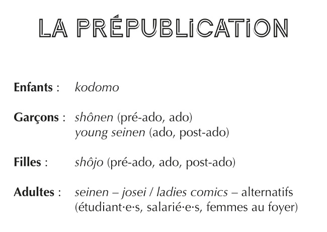Il existe de nombreux magazines de prépublication (mangashi) et ils visent tous une tranche d’âge et un genre. C’est un marché très segmenté et c’est donc en fonction du public principalement visé que l’on va les classifier. Ceci dit, les magazines papiers sont de plus en plus remplacés par des sites internet de prépublication qui sont plus multi-audiences (par exemple le webzine Ura Sunday). Et comme les classifications japonaises sont assez mal utilisées en France, il vaudrait peut-être mieux les oublier pour s’intéresser plutôt aux types d’histoires proposées, comme le fait un éditeur comme Akata. Néanmoins, étant utilisés par quasiment tout le monde, voici un rappel des principales classifications qui sont faites : shônen, shôjo, seinen, josei mais aussi kodomo, etc.