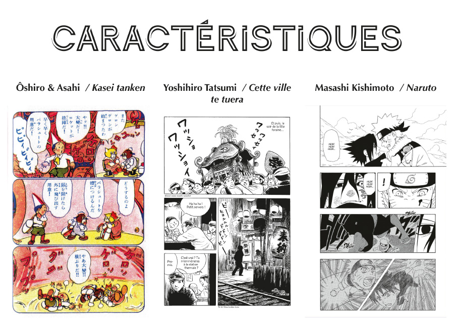 La troisième caractéristique du manga est moins perceptible car elle ressort de la narration et de la mise en page. Pourtant, il s’agit là d’une différence fondamentale avec la bande dessinée franco-belge et le comics. Il y a certes le sens de lecture de la droite vers la gauche mais c’est surtout l’agencement des cases et le rythme de l’action qui sont très différents entre ces trois pays de bandes dessinées. Le rythme de lecture dépend, pour commencer, du nombre de cases par planche. Dans le manga, ce nombre est généralement compris entre quatre et six sur deux ou trois bandes de deux cases. Bien entendu, pour créer des « pages mémorables » ou créer une mise en situation, il est possible de descendre à deux ou trois cases et de jouer sur la notion d’ellipse. Les bandes sont aussi plus ou moins éclatées, surtout dans le shôjo manga, notamment pour donner du dynamisme à la composition, et donc à la narration. Cela permet aussi de retranscrire des émotions comme la confusion. De plus, les chapitres sont courts : 16 pages pour les hebdomadaires, 30 à 60 pour les autres rythmes de prépublication. La construction en feuilleton (que l’on retrouve aussi dans les comics) est liée à cette prépublication en chapitre des mangas.