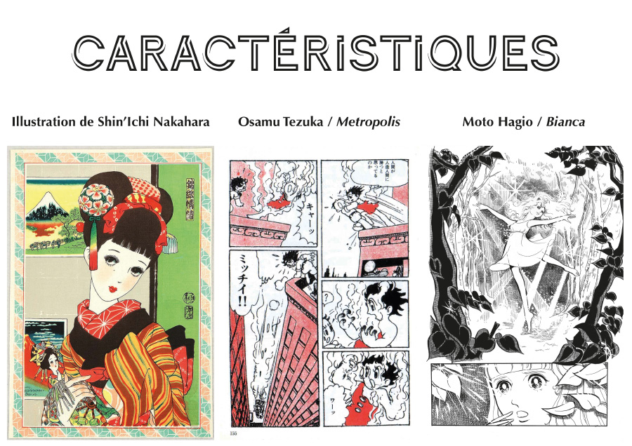 La deuxième est sans aucun doute les « grands yeux » qui peuvent occuper jusqu’à un quart du visage (sourcils compris), surtout chez les personnages féminins. Il ne s’agit pas de ressembler aux Occidentaux comme cela a été trop rapidement affirmé par les détracteurs du manga mais d’appliquer le principe de la néoténie au manga. En bande dessinée, il s’agit de la conservation de certains caractères de l’enfance afin de provoquer un attachement, une attirance inconsciente et abstraite chez les humains, y compris envers les animaux. Un bon exemple est celui du Chat potté dans Shrek 2, qui rappelle le chaton lorsqu’il fait les grand yeux. Utilisée en bande dessinée, cela provoque un sentiment de sympathie, crée une plus forte emprise sur les lecteurs. Walt Disney a énormément utilisé ce principe, vraisemblablement de façon inconsciente, notamment pour distinguer les gentils des méchants et créer une sorte d’attirance envers ses personnages. Mais Disney lui-même n’a rien inventé car on peut trouver des usages de la néoténie dans l’art du XIXe siècle. Au Japon, c’est aussi le succès dans les années 1920 des illustrations de Yumeji Takehisa dont le style a été de nouveau popularisé après-guerre par Jun’Ichi Nakahara qui peut expliquer l’importance des grands yeux dans la culture shôjo. Il ne s’agit donc pas d’une invention d’Osamu Tezuka qui était un grand amateur de Disney et connaisseur de l’imagerie née dans les magazines pour filles. Par son influence sur le style graphique des mangas des années 1950, Tezuka a surtout généralisé le phénomène.