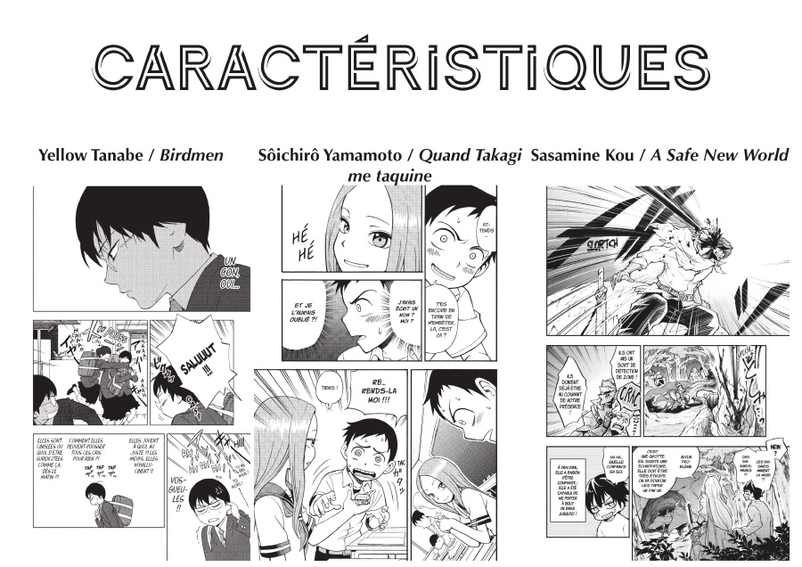 Enfin, outre l’omniprésence des onomatopées (il en existe même une pour signifier le silence, le fait qu’il ne se passe rien) dans de nombreux mangas (surtout ceux d’action), il y a toute une série de codes graphiques spécifiques au manga qui permettent de faire passer des émotions, mais aussi toute une gamme d’informations sur l’état des personnages. La goutte de gêne, la veine temporale gonflée de colère, les lignes de vitesse, les lignes de tensions, etc. sont des signes qui sont des marqueurs importants dans le manga, même si de nombreux titres japonais ne les utilisent pas, rappelons-le. Cela donne aux auteur·e·s tout un dictionnaire graphique pour dessiner des sentiments, donner des impressions, dynamiser l’action.