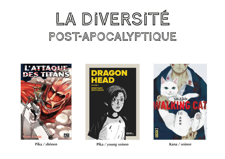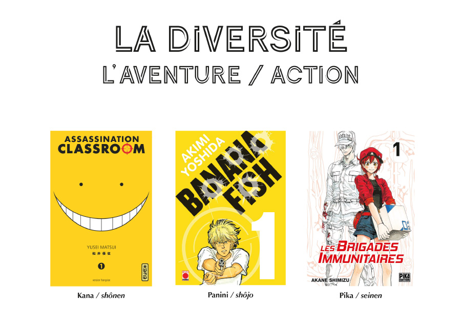 Le marché français, en plus de 25 années d’éditions francophones, a réussi plus ou moins, sauf peut-être pour le shôjo, à représenter cette diversité. Nous allons chercher à illustrer celle-ci par le biais d’une grosse cinquantaine de séries remarquables. Le souci rencontré est que de nombreux titres ne sont plus commercialisés (une licence doit être généralement renouvelée tous les 3 ou 5 ans) et ne sont plus disponibles qu’en occasion ou en bibliothèque. C’est pour cela que certains mangas évoqués ici ne sont plus trouvables en neuf, les librairies ayant dû retourner leurs invendus qui ont été ensuite détruits (quelques éditeurs préfèrent la solderie au pilonnage, ceci dit). Il faut avoir à l’esprit qu’un manga ne se contente pas d’avoir un seul thème mais en mélange plusieurs (deux, trois, voire plus). La classification effectuée ci-après est donc personnelle, subjective, en se faisant à partir du thème considéré comme étant le principal.