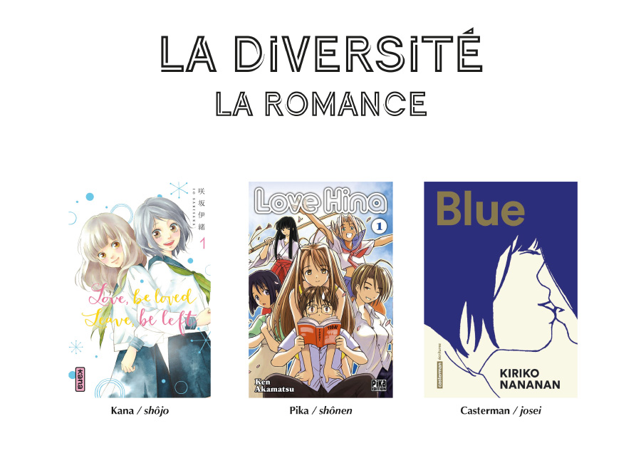 Les histoires d’amour sont associées aux mangas pour fille. Ce n’est pas faux mais ce n’est certainement pas exact. En fait, depuis la fin des années 1960, il s’agit du thème principal des séries qui sortent dans les magazines shôjo. Avant, il était interdit d’évoquer l’amour, même simplement sentimental. Ceci dit, il y a aussi de la romance dans les mangas pour garçon, même s’il s’agit le plus souvent d’un thème secondaire. Néanmoins, il existe des shônen où la relation amoureuse tient un rôle central dans l’histoire. Dans ce cas, le jeune garçon est maladroit, il ne sait pas aborder les filles qui sont pourtant nombreuses à lui tourner autour. On parle dans ce cas de « harem manga ».