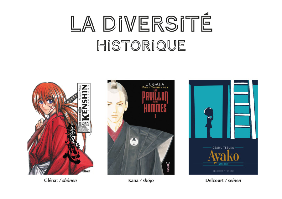 Tout comme la SF et le Polard, l’Histoire du Japon sert généralement de cadre à des fictions plutôt qu’être le thème principal. Pourtant, les titres dits « historiques » sont profondément enracinés dans l’époque où se déroule le récit et permettent d’avoir un véritable aperçu de la vie au Japon à travers les âges. Il faut aussi savoir que les Japonais ne sont pas très forts en Histoire, surtout que les manuels d’enseignement n’hésitent pas à occulter certains aspects peu glorieux du passé nippon.