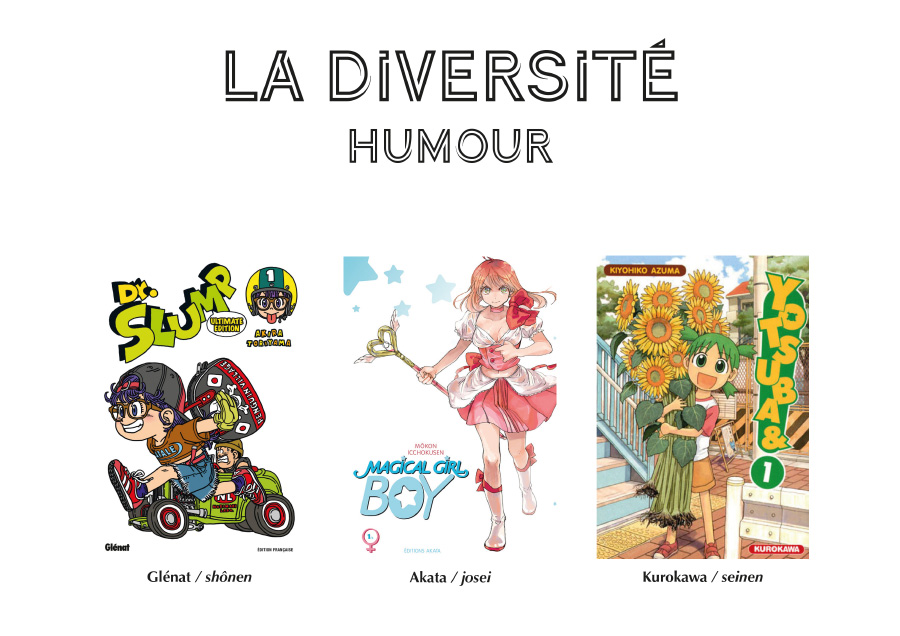 Les mangas d’humour pur sont aussi réputés pour mal se vendre en version française. Il faut dire que l’humour japonais est très 1er degré, très burlesque. Pourtant, les mangas ne sont pas tous basés sur un humour spécifiquement japonais comme l’est le manzai, un système basé sur un duo comique formé par le tsukkomi (le sérieux) et le boke (le personnage fruste, outrancier et désordonné). Si le couple comique (le sérieux et l’idiot) est un classique de l’humour dans tous les pays (Laurel et Hardy, Astérix et Obélix), c’est ici un humour qui repose beaucoup sur les quiproquos et les jeux de mots, ce qui fait que nombre de mangas relevant du genre sont réputés intraduisibles en français.