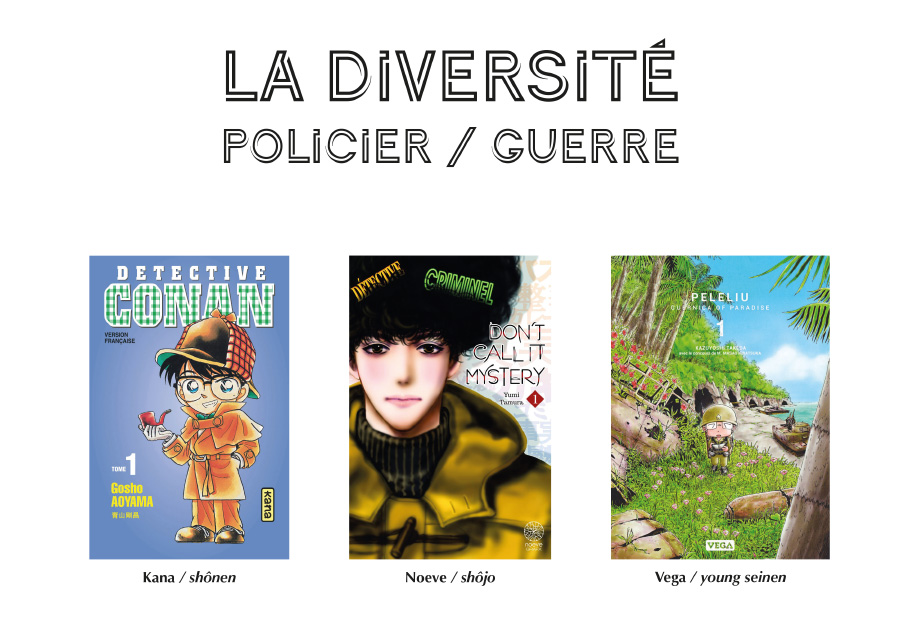 Le manga policier est assez développé au Japon, mais ne connais pas le succès chez nous. Que ce soit du thriller, du judiciaire, du crime à élucider, les thèmes sont variés. Il y a quelques années, Soleil Manga a créé une collection comprenant des adaptations mangas dédiées à un auteur de romans policiers à succès au Japon (Hiroshi Mori), mais cela n’a pas fonctionné.