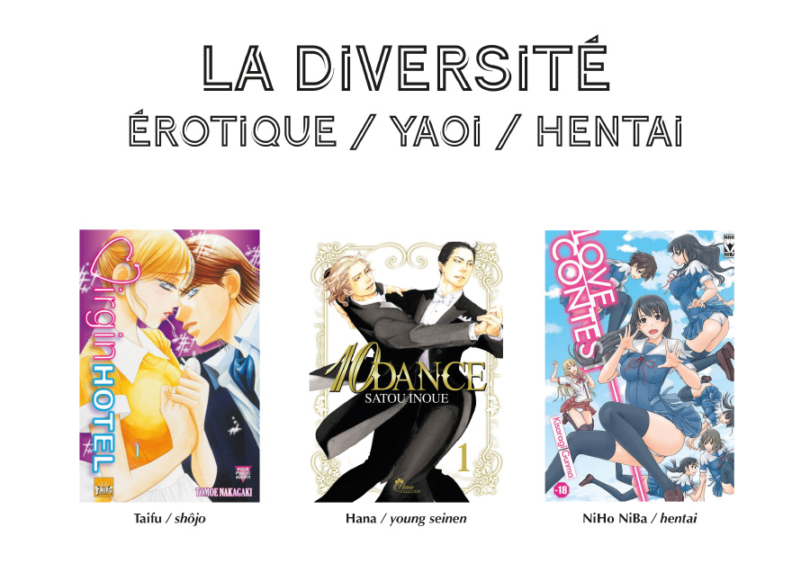 Si l’érotisme est souvent présent dans le young seinen, c’est généralement de façon secondaire. Il s’agit de placer très régulièrement des scènes à caractère érotique, généralement sans nudité explicite mais avec une sexualisation exagérée des personnages féminins (par exemple, avec des poitrines surdimensionnées). Cependant, il existe des magazines dédiés, allant du simple érotisme (l’acte sexuel n’est pas explicite) à la pornographie la plus débridée. Et cela n’existe pas que pour le public masculin. Il existe un genre de manga, le yaoi ou boys love, qui met en scène des amours homo-érotiques entre hommes écrit par des femmes à destination d’un public féminin hétérosexuel. Il existe aussi les shôjo dit matures où les relations sexuelles entre homme et femme ne sont pas simplement suggérées.