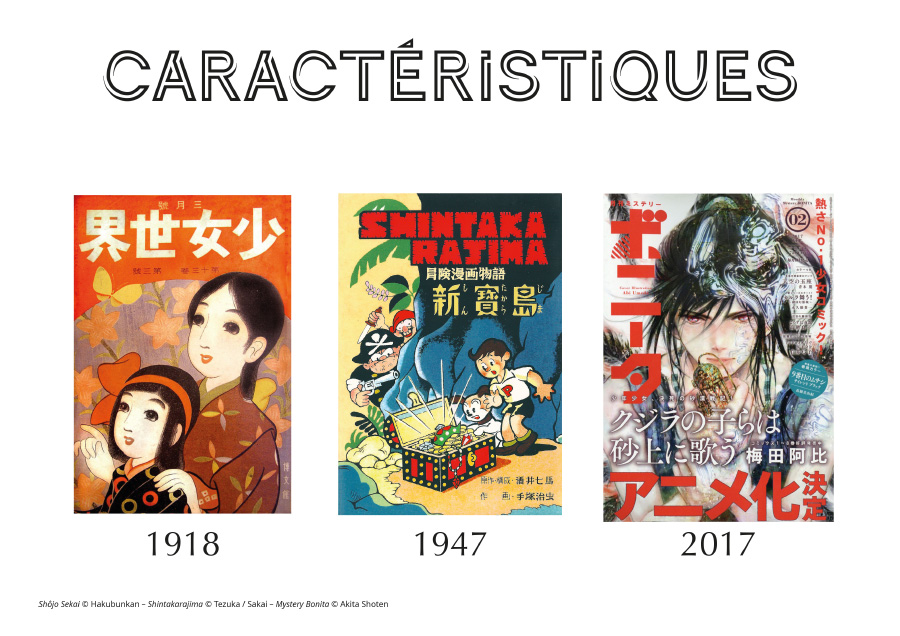 Il est difficile de caractériser le manga sans faire de généralités tant la bande dessinée japonaise est variée. Néanmoins, un certain nombre de caractéristiques sont relativement communes et associées au manga par le sens commun. La première de ces caractéristiques est certainement le noir et blanc et le petit format qui font ressembler les mangas à nos livres de poche. En effet, pour des raisons historiques de coût de création et de fabrication, le choix du N&B s’est imposé dans le développement des magasines d’après-guerre (avant, ils étaient fréquemment en couleur ou en bi ou trichromie). C’est une grande différence avec, par exemple, des États-Unis où la couleur s’est imposée, y compris dans la presse (pour les sunday). Les trames (mécaniques, c’est-à-dire autocollantes, puis informatiques) ont rapidement permis de donner du volume au dessin en l’absence de couleur. Cette utilisation des trames donne un cachet particulier au dessin qui est spécifique au manga. Il faut dire que les trames sont très variées au Japon et permettent de réaliser de nombreux effets, même si cela ne se voit pas trop sur certaines séries comme Naruto. La taille des mangas reliés est souvent comprise entre A5 (les deluxe) et A6 (les bunko). Le format le plus commun est le B6.