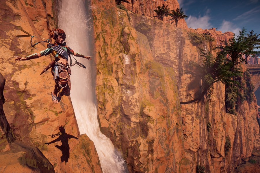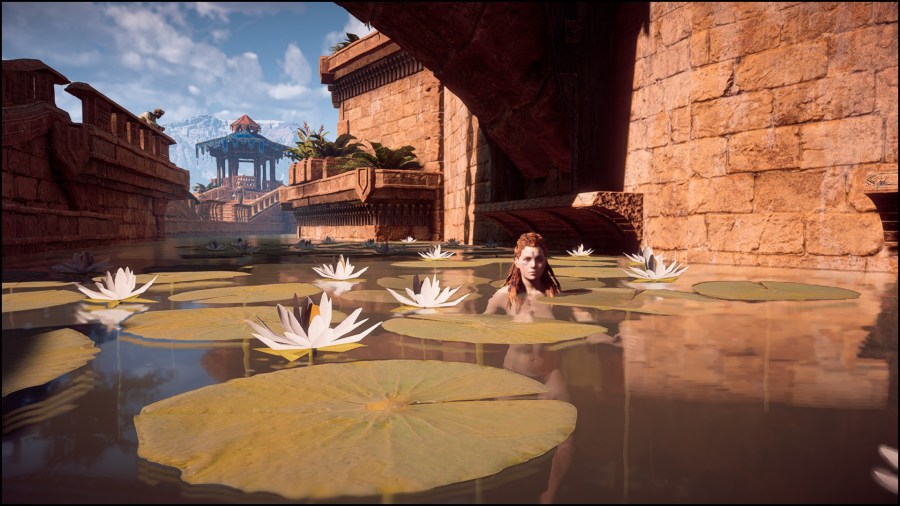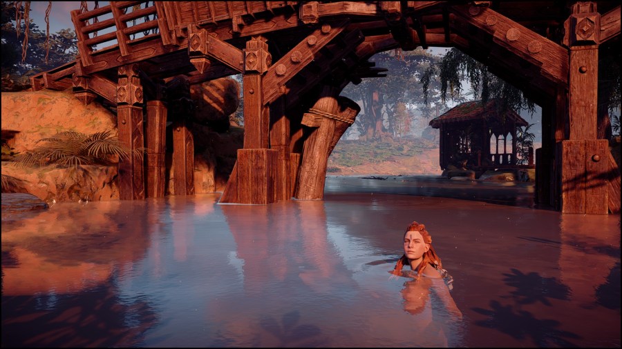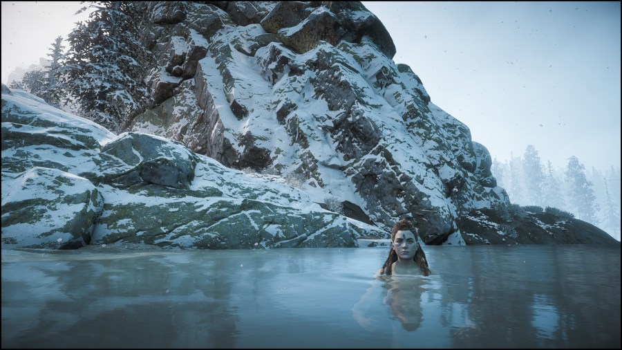 Ayant pensé à prendre son (petit) monokini, Aloy profite de nombreuses zones aquatiques pour prendre un bain et être la plus propre possible. Bien entendu, ce n’est pas toujours un moment de détente lorsque trop de machines rôdent dans le coin ou que l’eau est un peu trop froide.