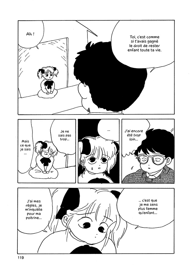 La petite amie de Minami est un conte moderne dont il est toujours aussi difficile de déchiffrer le message avec sa réédition de 2022 (la première édition date de 2011). Le refus de Chiyomi de faire connaître son état et de rechercher une solution pour retrouver sa taille d’origine révèle-t-il une absence d’acceptation à devenir adulte ? L’aide inconditionnelle que Minami apporte à celle-ci est-elle liée à un désir de toute puissance, à une envie d’avoir un jouet sexuel ou plutôt à un sens des responsabilités développé ? L’amour ne peut pas tout expliquer. Pourtant, il ne faut attendre aucune explication tout au long du récit ou lors de la postface de l’autrice. Ce flou n’est à aucun moment frustrant et n’empêche pas de ressentir les doutes, les questionnements et les peurs de nos deux jeunes gens. Il en résulte une lecture très plaisante, dont la subtilité peut amener les lectrices et lecteurs à réfléchir et c’est bien là le principal.