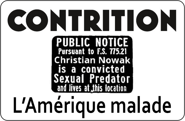 Toutefois, on pourrait regretter que les auteurs de Contrition ne prennent pas clairement le parti de dénoncer une législation aberrante typique de l’hypocrisie américaine. Les crimes et délits sexuels sont hystérisés par le puritanisme américain. Les peines peuvent être infligées de façon totalement hors de proportion dans certains cas. D’un autre côté, même si les deux problématiques sont différentes, les tueries de masse sont tolérées d’une manière totalement incompréhensible pour les Européens que nous sommes. Le système de fichage public et l’interdiction de se trouver à moins de 300 (ou 500 mètres voire plus) de tout lieu où peuvent se trouver un enfant est stupide dans l’optique de la réinsertion des individus condamnés ayant purgés leur peine et achevés leur période probatoire.