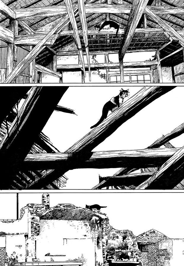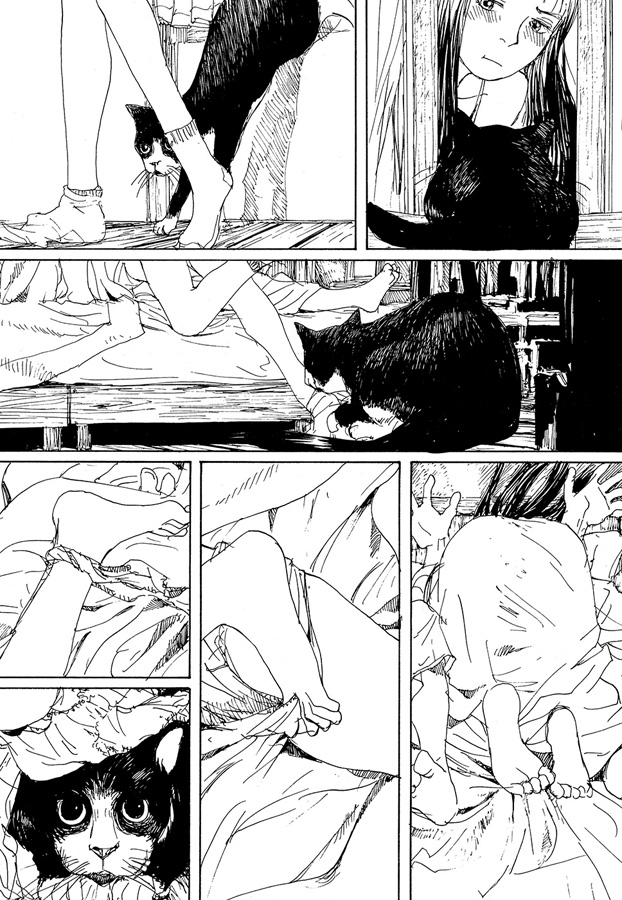 La Pomme prisonnière est donc un manga particulier, « un peu spécial » comme le dit lui-même l’auteur. Pour commencer, il est impossible de présenter l’histoire car il n’y en a pas. En vingt-deux chapitres, représentant seize saynètes sans lien les unes avec les autres (certaines sont très courtes car ne comptant que trois pages), nous suivons les rêves, les cauchemars ou les agissements de Mariel, la détective privée du manga Forget-me-not. Le point commun à tous ces petits récits ? Le chat Oni. N’oublions pas les nombreuses apparitions de félidés en plus d’Oni avec, notamment, M. J, Hana et Chee. Il y aurait pu avoir un autre point commun avec la nudité de notre héroïne. Cependant, il arrive parfois que Mariel reste habillée. Venise aurait pu être un troisième fil rouge, mais la plupart des chapitres se passent dans des ruines à demi immergées qui pourraient se trouver n’importe où en Méditerranée. Quoi qu’il en soit, les chats sont représentés de manière réaliste, leur comportement est incontestablement crédible. Nous pouvons donc prendre La Pomme prisonnière avant tout pour une déclaration d’amour envers la gent féline, mais avec une contrainte : faire un manga avec des filles nues, dans la lignée de Hita hita, cet art book où Tsuruta s’en était donné à cœur joie.