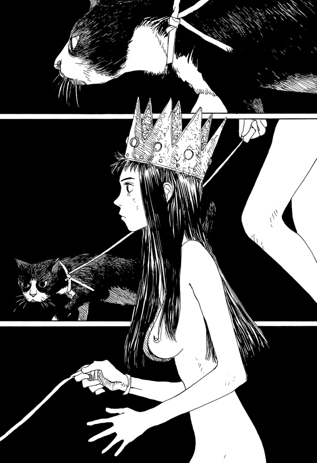 Il y a un an une sorte d’Objet Manga Non Identifié est sorti chez Noeve Grafx sous un titre étrange : La Pomme prisonnière. Comme l’explique Kenji Tsuruta dans sa postface, il s’agit en quelque sorte de la continuation sous forme de manga de ses travaux d’illustrations publiés dans un art book intitulé Hita hita. Il en profite pour expliquer quelles associations d’idées lui ont permis de passer de Hita hita (une onomatopée faisant référence à la submersion) à La Pomme prisonnière (en français dans la version originale). Il se révèle très rapidement que cette bande dessinée est en fait un improbable croisement entre deux passions de l’auteur : les chats et les filles nues. Voyons donc comment le mangaka en est arrivé là et quel en est le résultat…