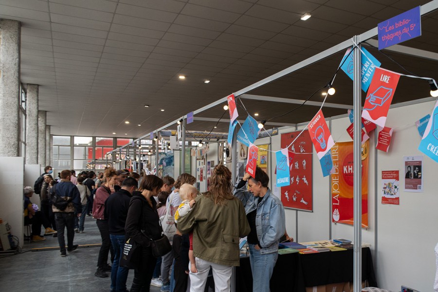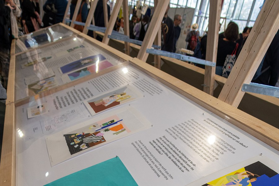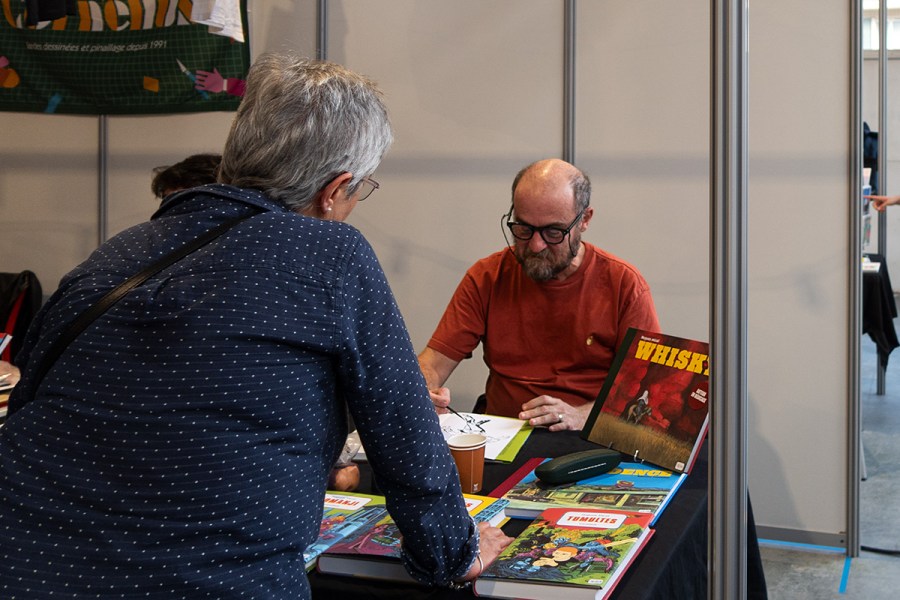 Surprise ! Sis dans un endroit fermé de petite taille, sans aération, regroupant stands et expositions, le Village des éditeurs est moche, étouffant et peu pratique. Nous sommes vraiment très loin de l’espace (presque) bucolique de la médiathèque Françoise Sagan et du Carré Saint-Lazare. Les deux rangées de petits stands séparées par ce que les organisateurs ont appelé pompeusement « expositions » n’aident pas à circuler. Heureusement, il n’y a pas énormément de monde alors qu’on est samedi après-midi… Les « gros » éditeurs indépendants sont situés dans la partie intérieure du Village, les alternatifs sont tournés vers l’extérieur. La fréquentation des stands, comme souvent, dépend beaucoup de la présence ou non d’autrices, d’auteurs. Par exemple, L’Association a des poids lourds en dédicace, à la plus grande joie des bulledairiens : Emmanuel Guibert, Edmond Baudoin, Vincent Vanoli (entre autres) sont au travail. Et comme il n’y a pas beaucoup de monde, cela permet de discuter et de multiplier les demandes de « petits mickey ». Autre exemple, Agnès Hostache attire du monde sur le stand du Lézard Noir. Sur le stand de çà et là, nous pouvons voir Martin Panchaud et sa machine à dédicace. Il est aussi possible de discuter longuement avec Hugues Micol chez Cornélius, et même de le charrier gentiment sur ses sinogrammes dans Romanji. Il ne faut non plus oublier de passer voir les plus petits stands car il y a toujours moyen de trouver quelques titres difficiles à trouver en librairie et même rencontrer son auteur ou son autrice, à l’exemple de Maou et de son Fleur de prunier édité chez un petit éditeur de Lausanne ou acheter le dernier numéro de Rita, une revue montreuilloise (Montreuil Powa !).