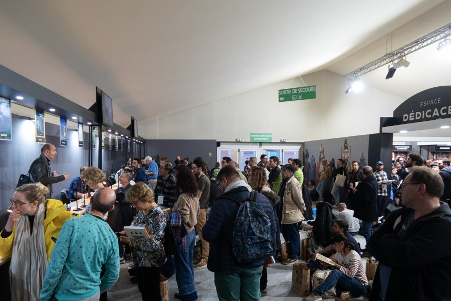 Après avoir exprimé un avis peu enthousiaste sur les expositions proposées lors de la cinquante et unième édition du Festival International de la Bande Dessinée d’Angoulême, il est temps d’être un peu plus positif. En effet, la richesse de la programmation permet de privilégier différents types d’activité en fonction de ses sensibilités du moment. En l’occurrence, cette année, étant donné que j’avais un peu de temps disponible, j’avais décidé de « jouer » au chasseur de dédicaces (je n’en avais ramené aucune l’année précédente). Et, généralement, je ne dépasse pas une ou deux à chaque édition. En effet, il s’agit d’une occupation réputée chronophage. Là, j’avais dans l’idée de faire signer cinq ouvrages (avec adjonction d’un petit dessin si possible). Ce n’est pas tant la dédicace qui m’intéresse que le petit moment passé avec l’auteur ou l’autrice, petit moment permettant de bavarder un peu.