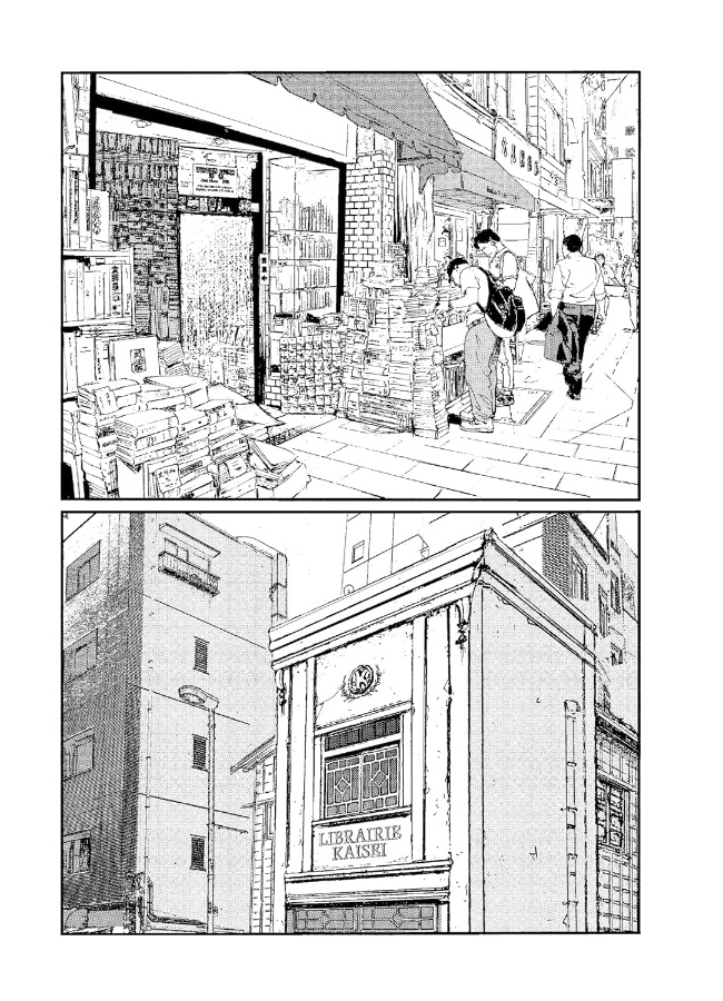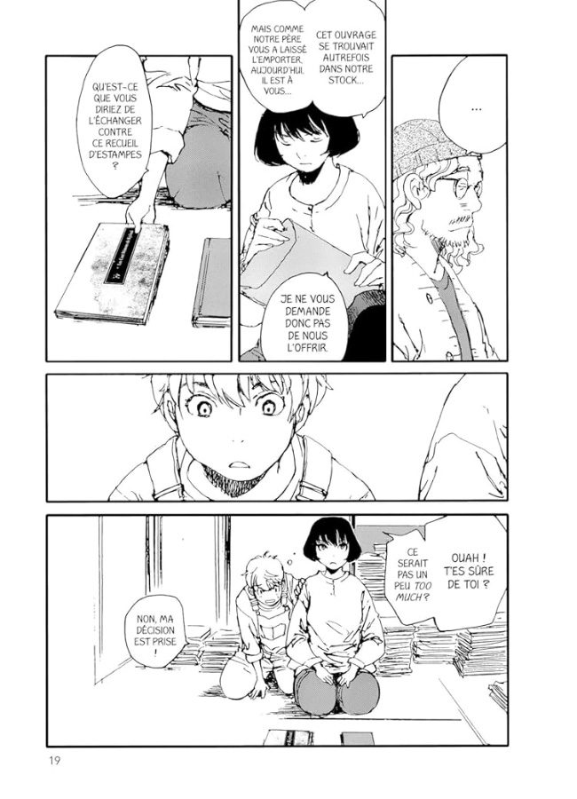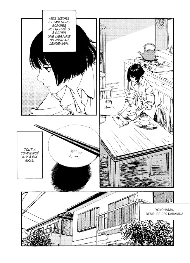 Tout au long des six tomes, nous suivons la vie des trois sœurs Karakida qui ont emménagé dans le quartier tokyoïte des bouquinistes, Jimbôchô. En effet, leur père qui vit et travaille aux USA, a hérité de la célèbre librairie d’occasion familiale et il a été décidé en commun de reprendre l’activité plutôt que de se séparer d’un lieu emblématique et chargé d’histoire. Toutes les trois viennent s’y installer (elles ont perdu leur mère il y a bien longtemps), à l’étage comme il se doit. Ichika, l’ainée, ayant un travail stable, Minoru, la petite dernière étant encore lycéenne, c’est donc à Tsugumi que revient la lourde tâche d’assurer la gestion de l’établissement, de faire le tri dans un stock énorme et bordélique, d’apprendre ce qui a de la valeur et ce qui n’en a pas afin de ne pas acheter n’importe quoi ou de vendre à vil prix. Heureusement qu’elle aime les livres sous toutes ses formes. Elle semble donc faite pour se métier, si dur (et parfois physique) qu’il soit.