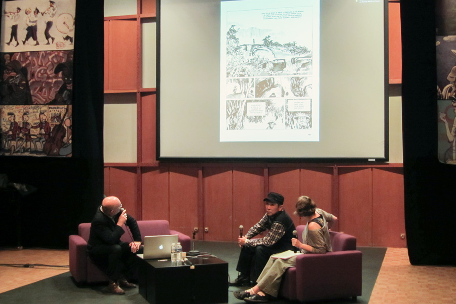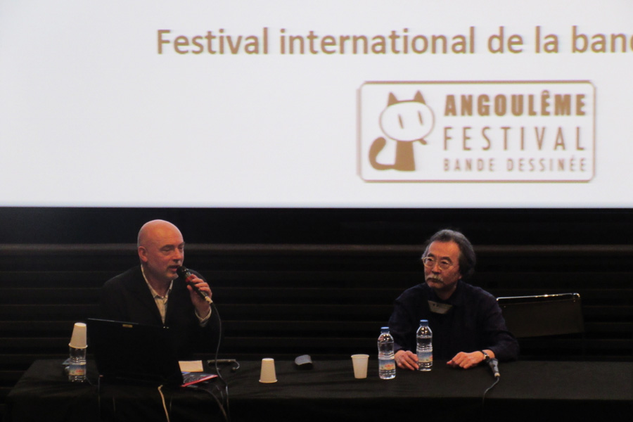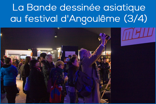 Cette fois encore, c’est en dehors de Little Asia que les fans de BD asiatique peuvent espérer trouver leur bonheur. C’est tout d’abord au Conservatoire Gabriel Fauré (dont la programmation est depuis 2011 sous la responsabilité de Jean-Paul Jennequin, spécialiste BD et traducteur) qu’il est possible d’assister à deux conférences, une sur Shôtarô Ishinomori (par Vincent Zouzoulkovsky, traducteur) et une autre sur Moto Hagio (par votre serviteur). Deux rencontres intéressantes sont proposées dans l’auditorium, la première avec Li Kunwu (Chine) et la seconde avec Tony Valente (France) dont le manfra rencontre un grand succès. L’espace Franquin permet de rencontrer à deux reprises Atsushi Kaneko (un habitué du festival), notamment à une Rencontre dite Internationale en duo avec le timide Suehiro Maruo. À l’arrivée, tout cela est bien léger, comme je l’affirmais à l’époque dans le traditionnel mini-siteMangaverse à Angoulême. Cependant, ce n’est pas bien gênant : il y a bien d’autres choses à faire et à voir… De plus, n’oublions pas l’exposition causant l’ire de quelques Japonais venus protester contre sa tenue lors du festival : « Fleurs qui ne se fanent pas » est située dans les Caves du Théâtre. Organisée par le gouvernement sud-coréen, elle veut « témoigner de l’histoire de ces femmes qui […] continuent à se battre pour la reconnaissance par le Japon de cette vérité historique faisant aujourd’hui encore polémique, […] l’histoire des femmes de réconfort ».
