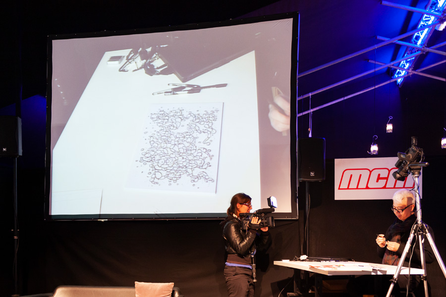 Entre 2016 et 2018, la bande dessinée asiatique occupe une partie du Monde des bulles 2 et retrouve ainsi un emplacement occupé en 2012. Intitulé « Quartier Asie », l’espace occupe tout le fond de la bulle en 2016 et met en évidence la moto de la série Akira (réalisée par un Japonais fan de l’œuvre d’Otomo, le Président de la présente édition en tant que Grand Prix 2015). Malheureusement, le programme n’est pas franchement intéressant, proposant bien trop de « performances graphiques » et trop peu de rencontres. En fait, seul le vendredi nous intéresse avec deux rencontres internationales, une avec Minetaro Mochozuki, brillamment animée par Xavier Guilbert (pour ne pas changer), et l’autre avec Ayako Noda, très moyennement conduite par Christian Marmonnier. À la décharge de ce dernier, le manga n’est pas sa spécialité et la mangaka est une jeune débutante, encore peu connue au Japon. Nous devons avouer que nous avons un peu séché les autres activités, connaissant plutôt bien l’industrie de la bande dessinée hongkongaise et la Comix Home Base. Une petite exposition, manquant malheureusement de cartels mettant en situation les planches proposées, présente différentes séries paraissant dans le magazine de prépublication HiBaNa, le successeur du regretté IKKI, magazine laissant une part importante aux auteures de seinen manga.