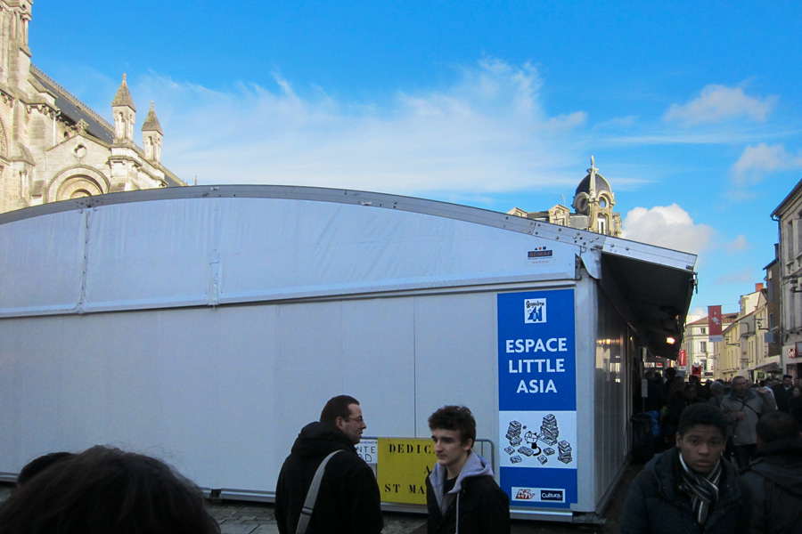 En 2014, Little Asia bénéficie à nouveau d’une bulle, celle située Place Saint-Martial. Benoit Mouchard n’étant plus le directeur artistique du festival depuis mars 2013, il est remplacé pour cette édition par un triumvirat composé de Stéphane Beaujean, Nicolas Finet et Ezilda Tribot (responsable Jeunesse au festival depuis plusieurs années). Il est donc légitime d’espérer qu’un programme digne de ce nom soit à nouveau proposé en ce qui concerne la bande dessinée asiatique, aidé en cela par la présence de Kazé. Las… Ce n’est pas le cas : impossible de ne pas y voir une redite de l’année précédente entre performances graphiques (sauf que cette fois, ce sont surtout des Taïwanais·es), projections de la (toujours sans intérêt) websérie Raconte-moi un manga, et nouvelle conférence sur Naoki Urasawa. L’espace en lui-même est déserté par les éditeurs francophones (ils sont dispersés dans les différentes bulles). Par contre, il est envahi par les vendeurs de produits dérivés et autres goodies. Seuls les stands des délégations taïwanaises et sud-coréennes valent la peine d’aller voir la bulle. Leur professionnalisme tranche d’ailleurs avec le reste. À l’arrivée, ce qui fait le plus parler de Little Asia est l’incident lié notamment à la location d’un stand par un groupuscule révisionniste qui refuse de reconnaître les atrocités commises par l’armée impériale durant la Seconde guerre mondiale et qui est interdit d’accès à la bulle durant le festival. Inutile de dire que nous ne mettons quasiment pas les pieds à Little Asia de tout notre séjour.