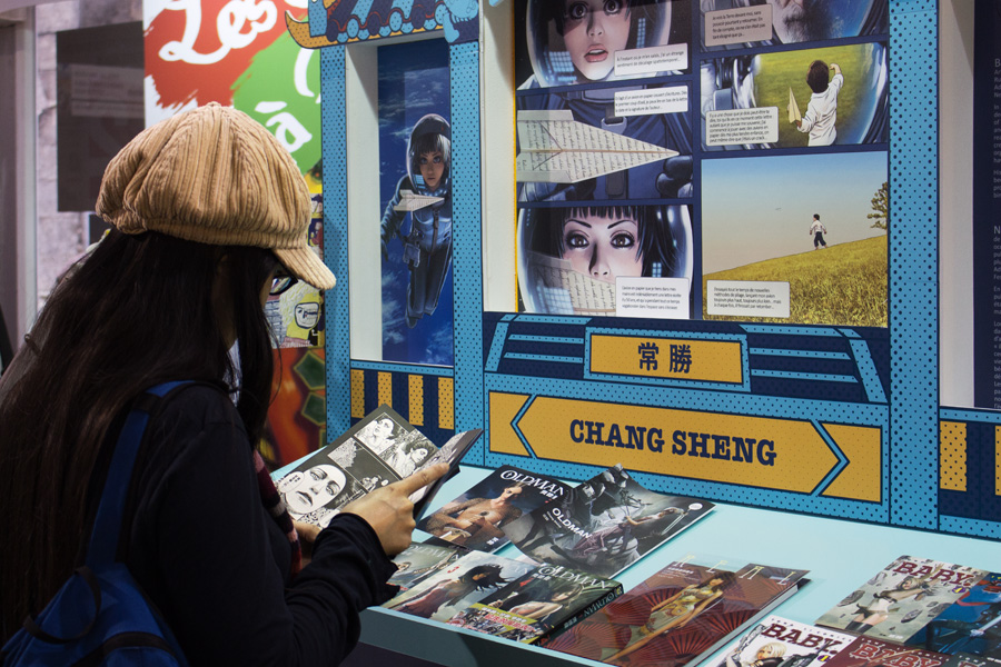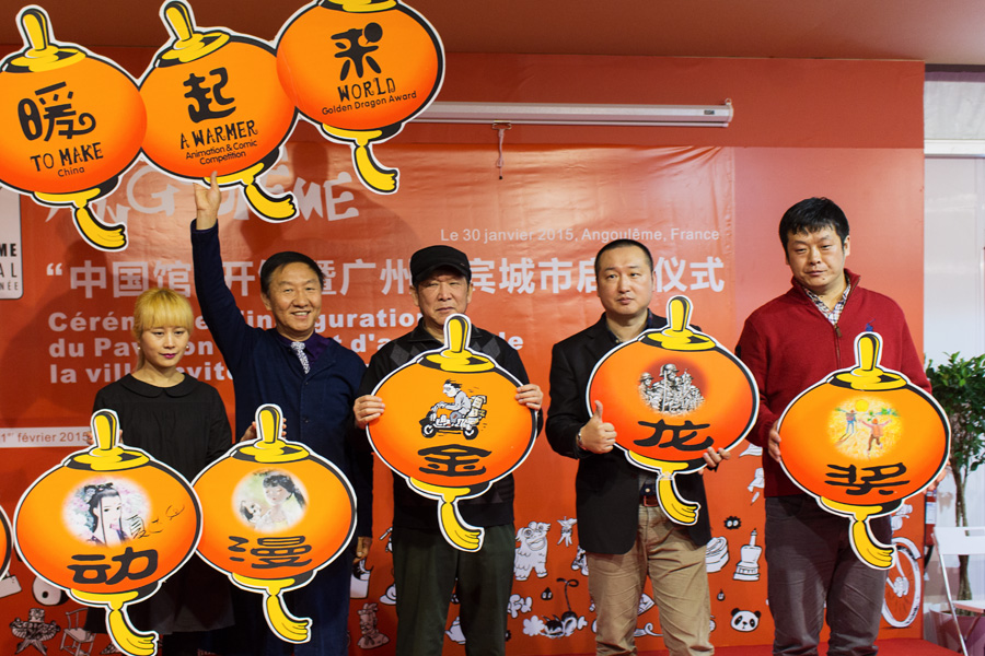 Le Pavillon Chine propose bien quelques animations mais cela consiste principalement en des démonstrations de dessin. Malheureusement, Xia Da, l’auteure des excellents Little Yu et La Princesse vagabonde est absente, étant malade, alors que nous aurions voulu pouvoir la rencontrer (l’une d’entre nous connaissant déjà son travail). Il reste toutefois une intéressante présentation de la bande dessinée chinoise par la mise en avant d’une dizaine d’auteur·e·s, dont Nie Jun, la tête d’affiche de la délégation chinoise. Le moment fort du Pavillon est son inauguration suivie de la signature d’un contrat d’édition ambitieux entre le groupe Dargaud et l’éditeur cantonais Comicfans. Le public est plutôt présent en nombre alors que ce genre de raout n’est censé n’intéresser personne en dehors des officiels et de la presse. Ce contrat aboutit au lancement du label Urban China, qui sera actif entre 2014 et 2019.
