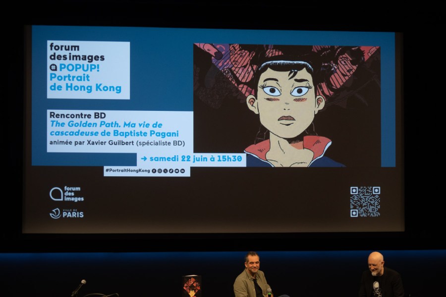 Il n’y a pas grand-chose à dire sur les trois rencontres auxquelles j’ai assisté, j’y suis allé plus pour passer le temps avant la projection des films prévus que par réel intérêt. L’assistance était d’ailleurs très clairsemée pour les deux premières. La table ronde « Hong Kong 2024 : quel avenir pour les artistes ? » n’était pas inintéressante mais convenue et prévisible. Les témoignages de Lok Kan Cheung (une artiste du vivant, réfugiée politique en France, notamment organisatrice via CUBE [C3] du Festival des arts hongkongais d’Annecy) et de Justin Wong (dessinateur réfugié à Londres, dont une BD est disponible en français) confirmait ce que l’on peut penser de la censure imposée par la Chine continentale depuis plusieurs années. La « rencontre BD Golden Path. Ma vie de cascadeuse de Baptiste Pagani » était certes très bien animée par Xavier Guilbert (comme toujours) mais ni l’œuvre ni l’artiste ne m’intéressaient…